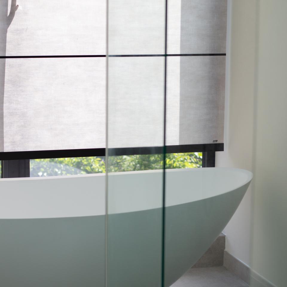 De exclusieve Luxaflex LightLine® rolgordijnen zijn een must voor de designliefhebber. Ze creëren een zacht licht dat gelijkmatig over het oppervlakte wordt verdeeld en de dessins zorgen voor een extra dimensie. Extra fijn in een badkamer met grote raampartijen, voor veel privacy en prachtig licht.